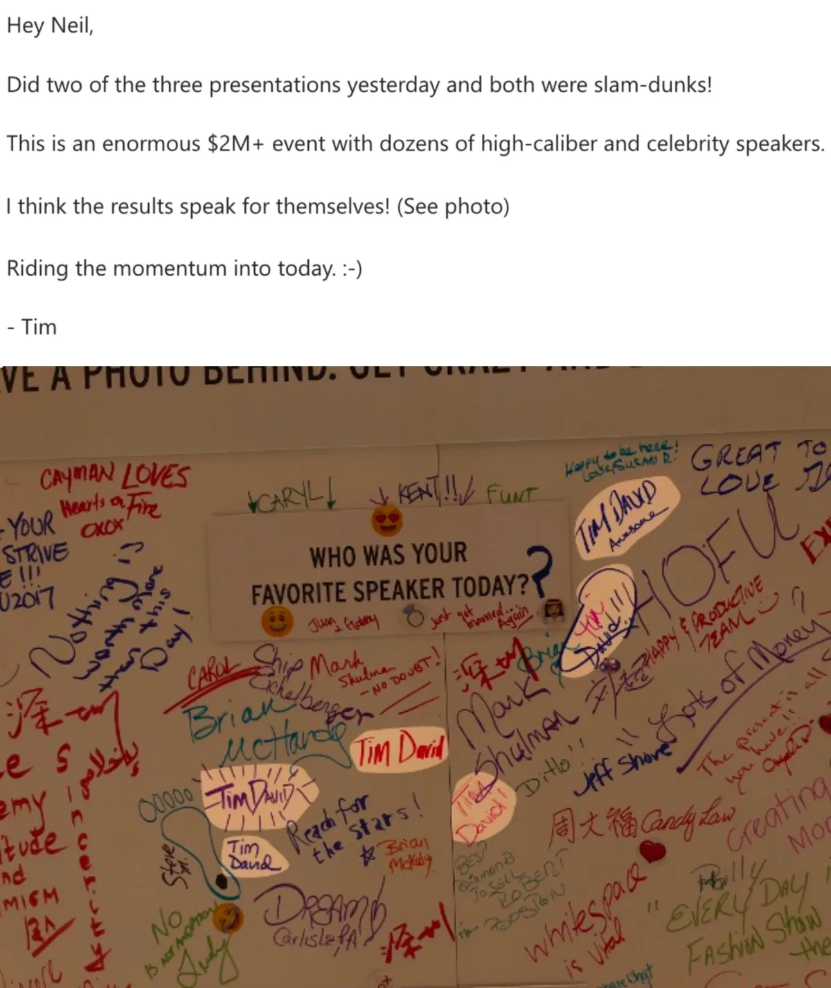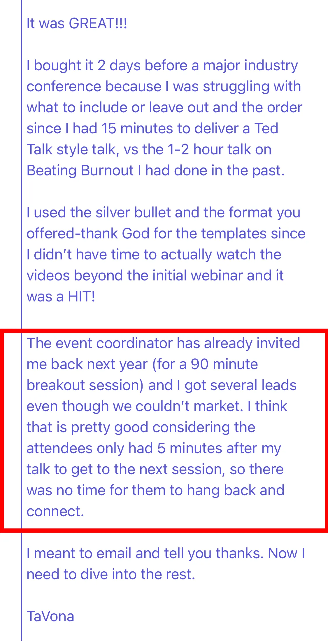 Another client got one of my programs and incorporated this approach into her talk only 2 DAYS before a conference.